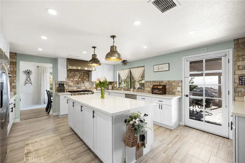 Updated ranch home in the hills of Nuevo with incredible panoramic views. This fully renovated 3-bedroom, 2-bathroom home with an office offers 2,500 sq. ft. of upgraded living space and sits on 5.5 acres of usable land.Inside, youll find an office, new tile floors throughout, carpet in the 2nd and 3rd bedrooms, fresh interior paint, a shiplap accent wall in the great room, and fireplaces in both the great room and the primary bedroom (the great room fireplace is double-sided, serving both the kitchen and the living area). The oversized primary suite includes a cedar-lined walk-in closet with built-in organizers and a bathroom with a custom rock walk-in shower.The kitchen is completely redone with Quartz countertops, newer cabinetry, a gourmet Thor cooktop, double ovens, new stainless steel appliances, a mini fridge, and custom open shelving. Each bedroom has a ceiling fan, and the guest bathroom has been updated with a new vanity, lighting, and tub with tile around. Additional upgrades include: brand new water heater, garbage disposal, water pressure pump with all new piping, a rebuilt septic tank with new caps. The garage has been converted into a spacious MIL suite but can be changed back to a 2-car garage as the original garage door remains. The suite has been fully renovated from flooring to cabinetry, with a new sink, range, and countertops. It also includes a custom-built walk-in closet, its own brand new AC unit, and a private exterior entrance with a dedicated outdoor area. Outside, the patio cover has been completely redone and there's a detached 20x30 garage/work