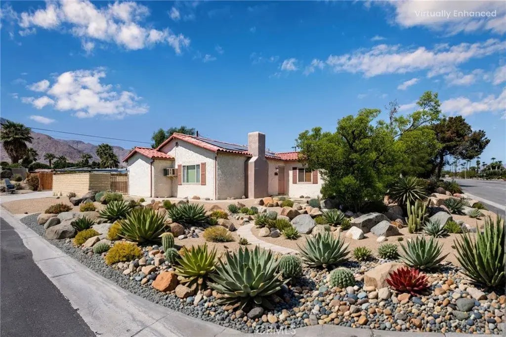 Timeless Spanish cottage in one of the BEST NEIGHBORHOODS in Palm Springs - Movie Colony East! NO HOA & LOW TAXES. Sited on a spacious highly coveted corner lot ... this charmer not only provides majestic views of our towering mountains as your personal backdrop but also abundant parking with easy navigation. A highly flexible exterior design affords for diverse landscape options - including a manicured front lawn, additional parking off N Sunrise, street parking off E Granvia Valmonte (easy to come & go) and a large driveway that can easily accommodate several vehicles or any RV/BOAT needs. An inviting interior space is highlighted by an updated gourmet kitchen with custom cabinetry, stone counters and stainless steel appliances. The kitchen is not only spacious but perfect for entertaining - with direct access to the backyard/dining room and a full size washer & dryer enclosure for easy washing after pool use. Archways provide seamless transitions throughout the home which is anchored by cohesive flooring - with both tile and hardwood providing easy maintenance. A contemporary fireplace accents the main living space, DUAL PANE windows help ensure energy efficiency + reduce exterior noise levels and SOLAR helps manage utility costs! The main hall bathroom has been expertly updated with a modern design and both bedrooms are well sized. When you have a POOL HOME ... you want to be able to maximize pool time for both you and your guests - we have you covered! The current exterior flex space has the ability to function as a garage, workshop, outdoor kitchen or would make a gre