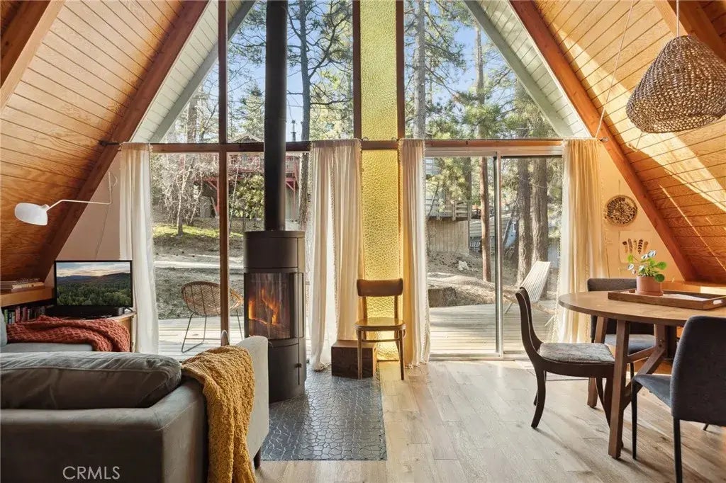 Escape to this beautifully updated A-frame cabin, where rustic charm meets modern comfort for a perfect year-round retreat. Step inside to be greeted by soaring vaulted ceilings and an open, airy living space designed for relaxation. Up the original floating staircase, the spacious loft offers a peaceful master hideaway and a charming mezzanine desk nookideal for work-from-home or creative inspiration. With thoughtful touches like AC, heating, and a ceiling fan, comfort is guaranteed in every season. The heart of the home is the rustic yet fully equipped kitchen, perfect for preparing delicious meals while staying connected to the warm and inviting dining and living areas. A striking Hase Bari fireplace (ultra clean catalyst combustion wood stove) serves as the centerpiece, creating the ultimate cozy ambiance. Down the hall, a charming guest bedroom and a beautifully finished bathroom with Cle cement floor tile, provides a welcoming space for family and friends. Outside, a spacious shaded deck invites you to unwind with your morning coffee or stargaze on crisp mountain evenings, surrounded by the peaceful beauty of nature. The level parking pad offers convenience, complete with an EV charger for added ease. There is room to expand this modern, all-electric mountain retreat that offers both privacy and relaxation with an open treed lot and seasonal creek. Whether you're searching for a full-time mountain escape, a weekend getaway, or a turnkey short-term rental, this enchanting cabin is ready to welcome you home.