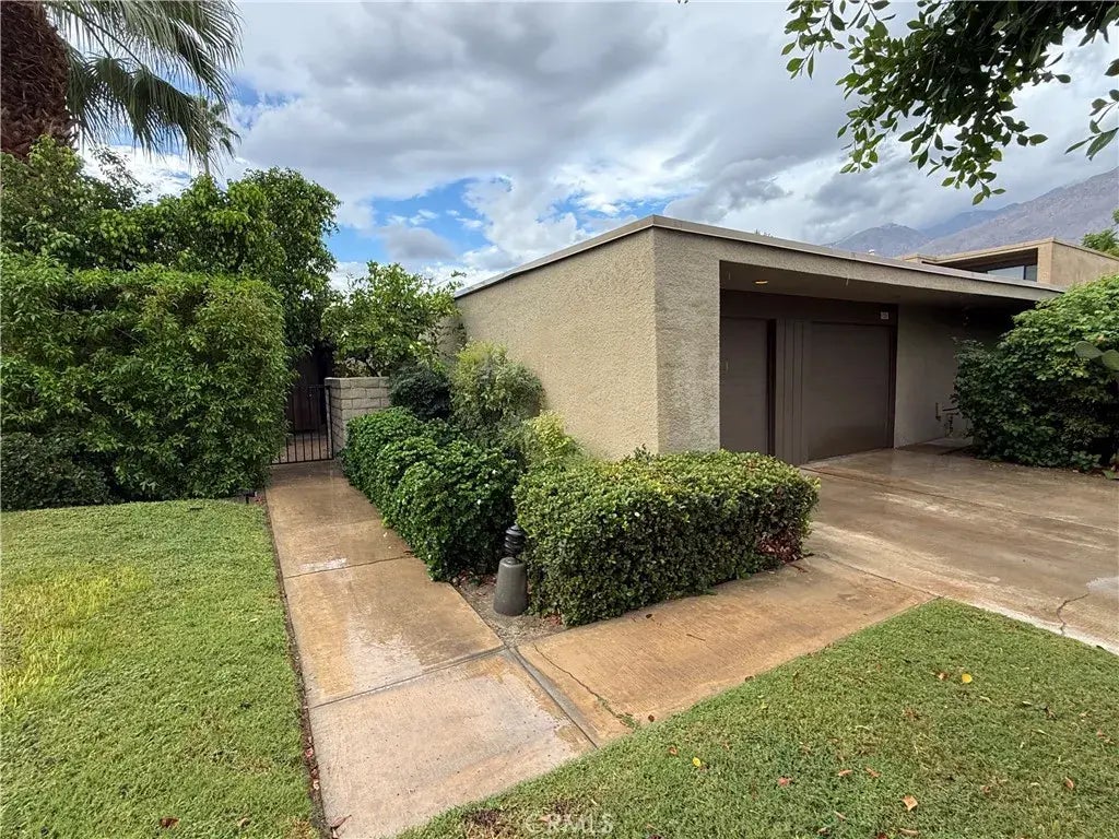 Located in the highly sought-after Rose Garden, this spacious single-level 2-bedroom, 2-bath condo designed by Donald Wexler offers iconic mid-century style and comfort. Set on leased land with an option to purchase and convert to fee ownership ($230,000 approximate buyout cost), this home features a private front courtyard, covered back patio, and lawn area with breathtaking mountain views. Inside, enjoy vaulted ceilings, tile floors throughout, a remodeled kitchen with stainless steel appliances, inside washer/dryer, and an attached garage. The primary suite boasts a spacious bathroom, while the second bedroomperfect as an officeopens to the private front courtyard. Just steps from community amenities and ideally located near downtown and the airport, this lock-and-leave condo is the perfect Palm Springs getaway for jetsetters or anyone seeking easy, low-maintenance living. The resort-style complex offers 2 pools, 3 spas, 2 tennis courts, and 4 new pickleball courts.