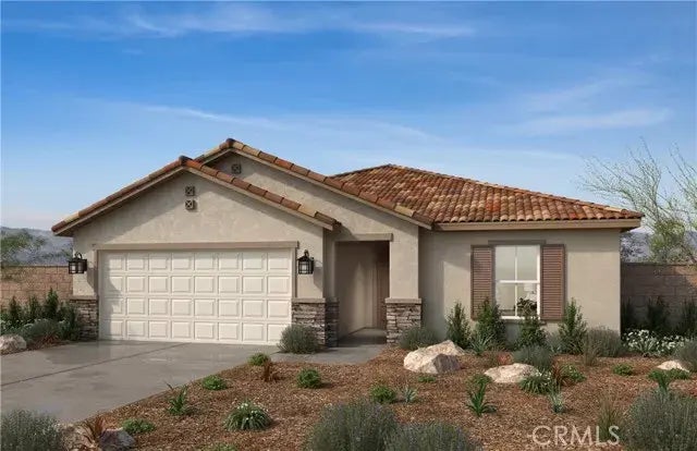 Brand-new single-story neighborhood by KB Home-Cielo at Nuevo Meadows in Nuevo. This home features 3 bedrooms, 2 baths and 2 car garage. Large great room opens up to a nice sized kitchen with white thermofoil cabinets and white quartz countertops. Energy star qualified home to help save on your future energy bills. Sunpower solar system. All electric community. Convenient access to I-215. Future community amenities are parks and walking trails. Photo is a rendering of the model. Buyer can either lease or purchase the Solar.