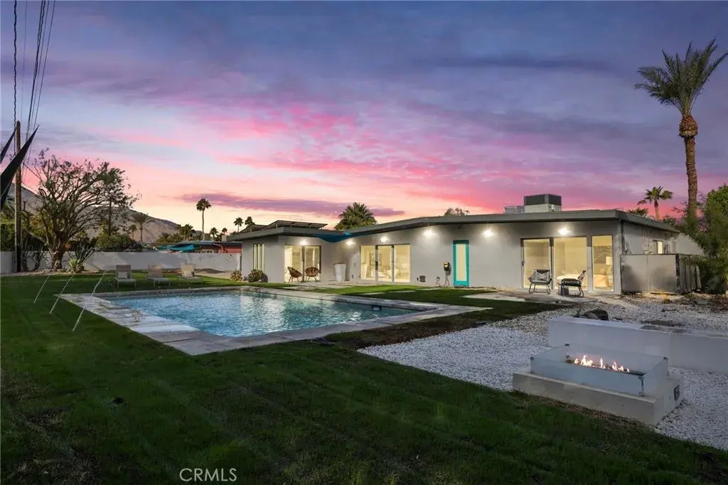 PAID SOLAR! Welcome to El Rancho Vista Estates, one of Palm Springs most celebrated mid-century enclaves. This architectural compound, designed by the renowned Donald Wexler, was built in 1960 and offers a rare 3-4 bedroom option, 3-bathrooms, offering 2,195 square feet of living space on one of the largest lots in the neighborhood. Recently renovated, the home seamlessly blends modern upgrades with the timeless beauty of mid-century design. You'll love the open floor plan that features expansive glass windows that invite natural light and stunning views of the pool and lush yard from almost every room, decorative mosaic tiles in the bathrooms, and clerestory windowsclassic elements of mid-century modern architecture. The spacious, modern kitchen is a true focal point with Electrolux stainless-steel appliances. Set on a 16,117 fully landscaped lot, the oversized backyard is a true desert retreat. Enjoy a sparkling pool with a tranquil water feature, a fire pit with seating, and plenty of room for outdoor activities like volleyball, croquet, or creating your own play field. The possibilities are endless here for outdoor living and entertaining. As if that wasn't enough, the home comes equipped with a new electrical panel, newer HVAC system and 55 fully paid-for solar panels, ensuring energy efficiency and lower utility costs throughout the year. This property is ONE-OF-A-KIND with easy access to downtown, golf and dining at Escena Golf Club and so much more.