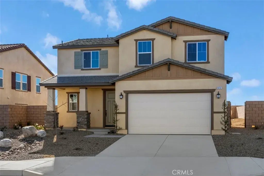 This meticulously crafted, two-story home, which showcases water-efficient front yard planting. Inside, discover an open floor plan with 9-ft. ceilings and luxury vinyl plank flooring. The kitchen boasts thermofoil cabinets, Carrara Mist quartz countertops and Whirlpool stainless steel appliances. Upstairs, the primary bath features cultured marble countertops, oval undermount sinks and a walk-in shower. Additional highlights of this all-electric home include a smart thermostat, LED lighting and solar energy system. Buyer can either lease or purchase the Solar.