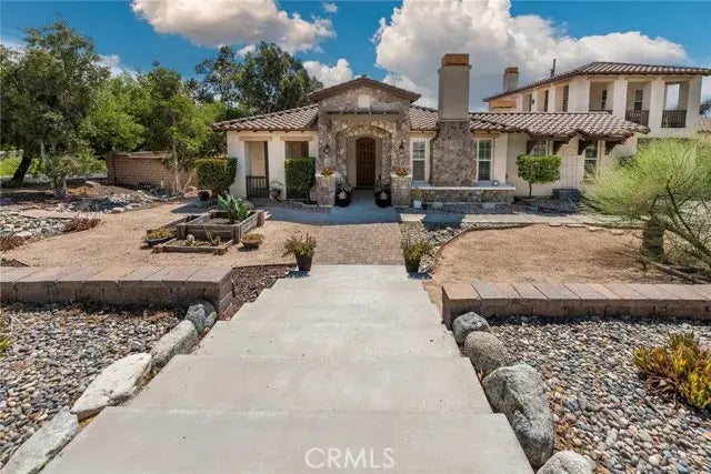 Wonderful Mountain View Home on Corner Lot, with no neighbors behind! Single story floorplan with interior courtyard with wood-burning fireplace and one-bedroom apartment, separate from main home, above the 3-car garage. Large front porch with stone entry facade. Formal living room with fireplace offering arched opening into the formal dining room, featuring butlers pantry with French doors to the interior courtyard. Convenient bathroom near entry offers in suite bathroom. Spacious family room with fireplace is open to the kitchen with large center island with loads of cabinetry and counter space, gas cooktop, sink and breakfast bar. The eating area in the kitchen offers a recipe desk and access to backyard. Guest powder room. Laundry room with sink and door to exterior of home. Luxurious master bedroom with fireplace, master bathroom with soaking tub, dual vanities, separate shower. Separate one bedroom apartment above garage offers view balcony, kitchenette and full bathroom. Covered patio, hills and city lights views from the backyard. This home offers RV Access, drought tolerant landscaping, High Ceilings, Wide Hallways, ceiling fans, shutters, tile and wood flooring, solar, putting green, BBQ Island, and more! Must see! Awesome location, well above the 210!