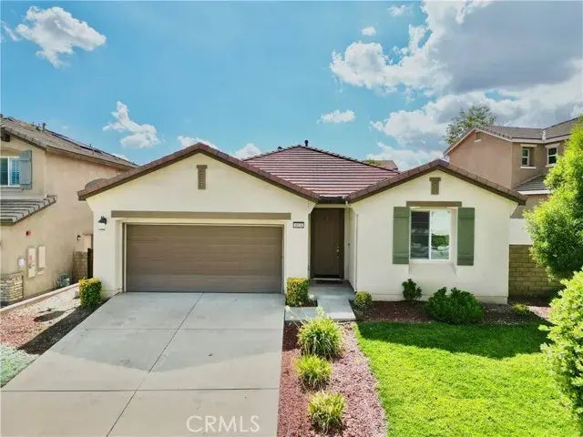 Welcome to this beautiful home, built in 2015, nestled in the highly sought-after Rosena Ranch community. With its commuter-friendly location near the 15 freeway, you'll enjoy easy access to shopping centers, CSUSB, and everything the area has to offer. Step inside to find two well-appointed bedrooms and a full bathroom right off the entryway. The home then opens up to a spacious formal dining room that seamlessly flows into the open-concept kitchen and living area. Perfect for entertaining, the living room boasts a cozy fireplace and connects effortlessly to the kitchen. The kitchen is a chef's delight, featuring elegant granite countertops, matching appliances, and abundant cabinet space for all your storage needs. Retreat to the generously sized primary bedroom, complete with a walk-in closet. The en-suite bathroom offers dual sinks, a separate shower, and a relaxing soaking tub. Convenience is key with a laundry room located in the hallway, offering plenty of storage and direct access to the attached 2-car garage. Step outside to a well-maintained backyard, featuring a cozy patio, manicured lawn, and a spacious side yard, perfect for outdoor activities or gardening. This property is a true gem and an absolute must-see!