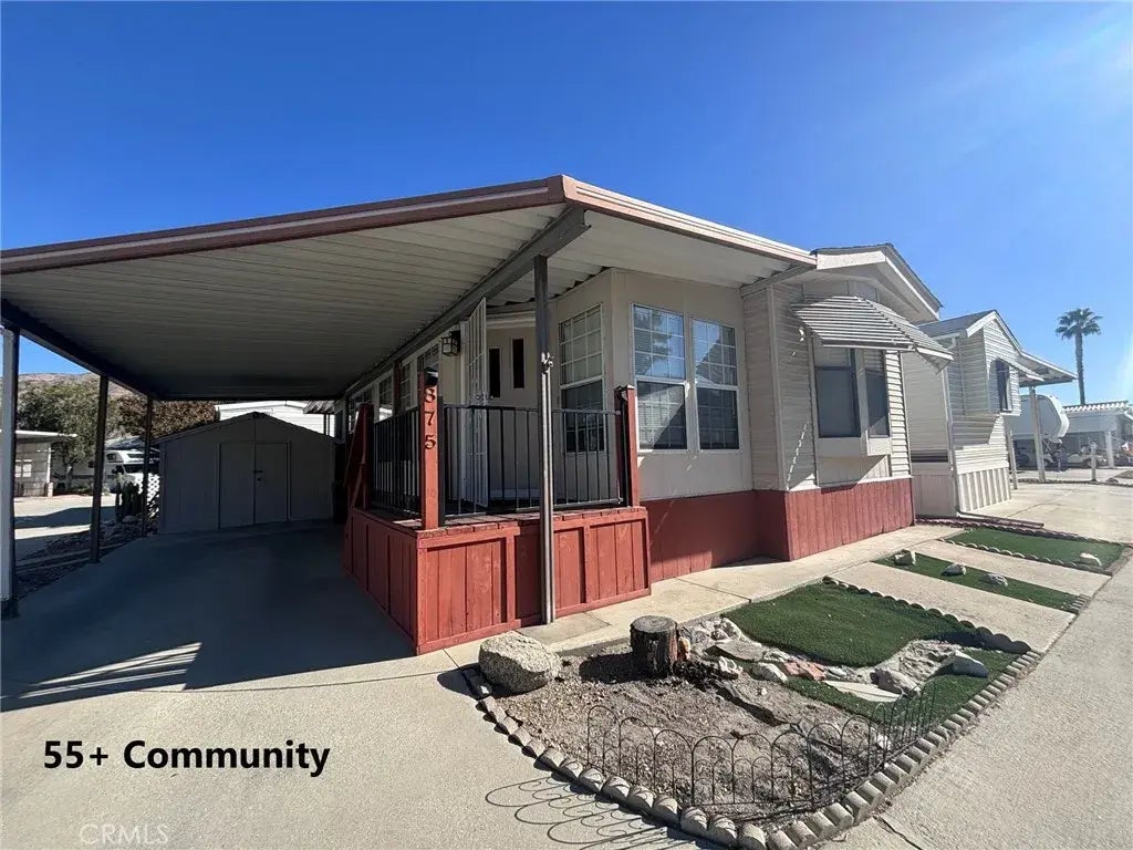 Charming 55+ Home in San Jacinto! This delightful home features two bedrooms and one full bathroom. Enjoy a spacious living room and a large family room with a ceiling fan and bay-style windows that invite an abundance of natural light. The kitchen is open to the family room and boasts ample cabinetry, a double sink with a stainless steel faucet, and sleek black and stainless steel appliances. The main bedroom offers built-in cabinets around the window, as well as storage doors beneath the mirrored wardrobe closet. It also includes a built-in desk/makeup area and a media niche, offering plenty of extra storage options and a ceiling fan for comfort. The centrally located bathroom features a walk-in shower for convenience. ***Water, trash and basic cable and internet are included in the rent**** Throughout the home, you'll find wood-style flooring and additional built-in cabinets with glass doors perfect for displaying your treasured items. Window blinds/coverings add privacy and style. The exterior boasts a spacious double carport and a private patio with decking, ideal for enjoying morning coffee or evening breezes. Additionally, a generous shed is available for tenant use. Community Amenities: Resort-style clubhouse / Swimming pool and spa / Fitness center / Library /Billiards and card room / Banquet facilities / Outdoor barbecue area / Shuffleboard court / Laundry facility: No pets. Renter's insurance is required.