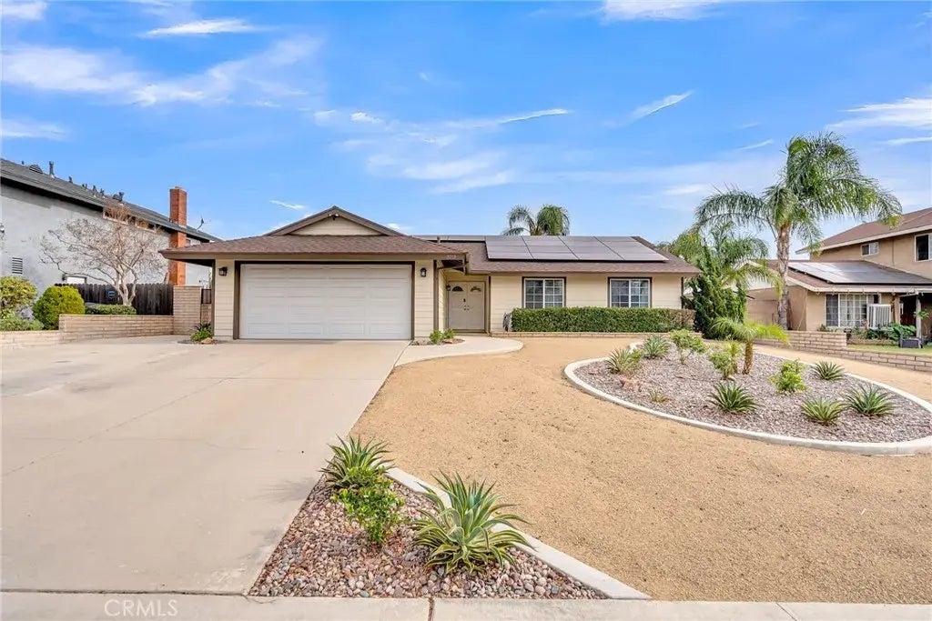 Pride of ownership is on display in this beautiful single-story home. Enter through the double doors into the warm and inviting living room with a vaulted ceiling, large windows and a cozy brick fireplace. The large open kitchen is bright and airy featuring tile flooring, tile counters, an expansive breakfast bar and a spacious adjoining dining room. Enjoy watching movies or playing games in the oversized family room. The primary suite features full-length mirrored closet doors, en-suite bath with vanity area and a sliding glass door leading to the outdoor spa. One of the secondary bedrooms has a built-in cabinet creating an ideal office space. The backyard features mature landscape, in-ground spa, a lattice covered patio and block walls with wrought iron gate. Additional property highlights include ceiling fans, stylish window casings, window blinds, newer windows and sliding doors, an attractive low maintenance front yard, an extended driveway for potential RV parking, and leased solar system.