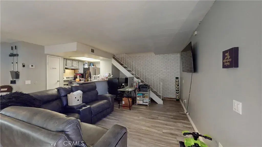 This charming 2-bedroom, 1-bath townhome-style condo in the heart of Highland offers the perfect blend of comfort and convenience. Spread across two stories, this home provides an ideal living space for those seeking both style and functionality. The attached garage offers not only secure parking but also additional storage, a rare find in the area. As you step inside, you'll be greeted by a recently remodeled interior that exudes modern elegance. The open living and dining area is adorned with sleek laminate wood flooring, which flows seamlessly throughout the home, creating a warm and inviting atmosphere. Fresh, neutral paint colors enhance the natural light, making the space feel bright and airy. The kitchen, though compact, is thoughtfully designed to maximize every inch of space. It features new countertops, modern cabinetry, and stainless steel appliances, making meal preparation a breeze. The efficient layout ensures that all your culinary needs are met without compromising on style. Whether youre whipping up a quick breakfast or hosting a dinner for friends, this kitchen is both practical and aesthetically pleasing. Upstairs, youll find two well-proportioned bedrooms, each offering ample closet space and large windows that let in plenty of sunlight. The shared bathroom has been tastefully updated with contemporary fixtures and a fresh, clean design. The condos location is truly unbeatable. Just minutes away, youll find the bustling Citrus Plaza and Mountain Grove shopping centers. Together, they offer over 520,000 square feet of retail and restaurant space, ensuring