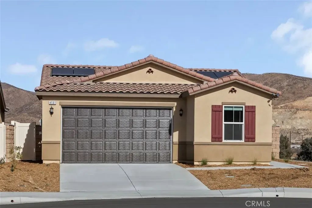 BRAND NEW! Spanish style single-story open concept home with 3 bedrooms, 2 bathrooms in the beautifully planned community of Terracina. The beautiful open kitchen features lots of cabinets, a large kitchen island and Whirlpool appliances including range, dishwasher, and microwave hood combo. The spacious primary bedroom and bath include a large shower with a walk-in closet and linen closet with lots of storage. This all-electric home is ENERGY STAR rated to save substantial money on utility bills. Within walking distance of community sports park. Ten-year limited warranty. Quick 15 freeway access just minutes away from Corona and Murrieta. Photo is a rendering of the model. Buyer can either lease or purchase the Solar.