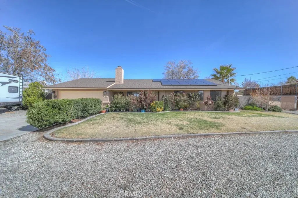 AMAZING HESPERIA HOME SHOWS PRIDE OF OWNERSHIP!! Nicely landscaped property with mature trees, flowers, shrubs, FRUIT TREES(pomegranates, peaches, nectarine, apple, apricot, fig, olives, prunes, donut peach, grapefruit, citrus, cherry) all over the yard with automatic sprinkler system. The home features three SPACIOUS bedrooms, 2 full bathrooms, with 2 car attached garage, one car detached garage with toilet, and a covered RV carport with roll up door. Also a Truck storage is included. Completely fenced in yard, with automatic gate. The home features many recent upgrades including, LED spotlights in every room, Smart Key, Decor wall switches/dimmer, Base casing and crown molding,Ceiling Fans, Bathroom/laundry exhaust fans, 7' roll up door installed, among others. Formal dining area has bay window looking into the rear yard. The oversized family room has a rock faced fireplace, built in bar and French doors open to the back patio. The living room features a second fireplace. The property comes with Solar Panels This Home Won't Disappoint, A MUST SEE!!!