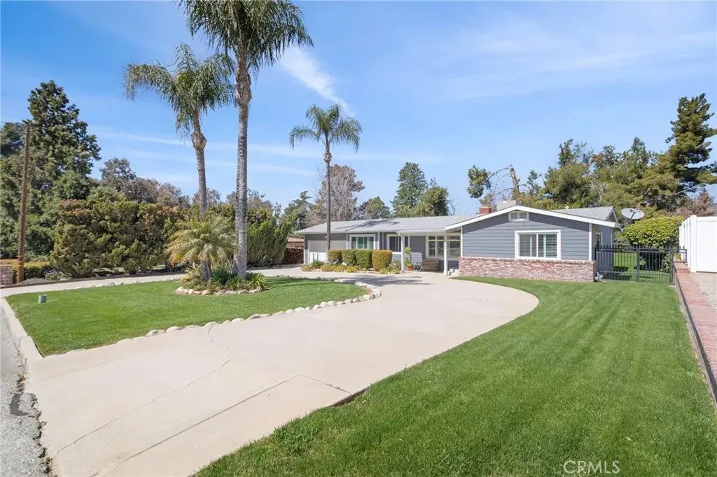 Nestled in a beautifully landscaped setting this home displays pride of ownership. This ranch-style home with modern gray facade and classic brick accents is complemented by a well-maintained front yard with lush green grass, mature palm trees and a vibrant flower bed. There is also a lighting system on the front which adds life to the landscaping at night. The spacious curved driveway provides plenty of parking. Inside you will find a cozy living room with a stone fireplace. The open layout of the living room connects to the rest of the home. The home has two bedrooms, one full bathroom, a dining space, laundry area, and a charming kitchen. From the kitchen sink, you will have a picturesque view to the serene backyard. The backyard has a mountain view and a beautiful lawn, ideal for outdoor entertaining or peaceful relaxation. It has an extended garage for extra storage and No HOA. This home features essential upgrades completed just about four years ago, including newer windows, roof, stucco, fascia board, gutters and other upgrades. Don't miss the opportunity to make this home your own!