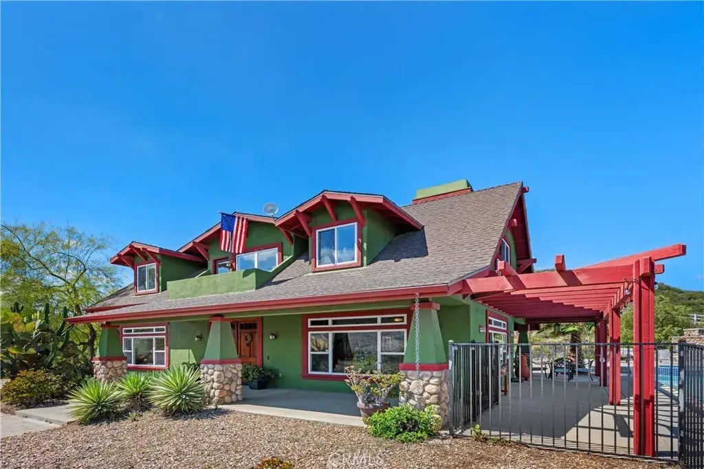 With breathtaking vistas of Lake Matthews, glistening city lights, and peaks of snow-capped mountains, this residence is a true sanctuary for nature lovers and design aficionados alike. Constructed in 2002 by Riversides Hansen Construction, this home was designed to the sellers specifications. Its craftsman bungalow style reflects a timeless aesthetic, with the home's trim and main color palette staying true to the craftsman tradition. As you approach the property, a long, winding driveway greets you, & at the top of the drive, a spacious parking pad awaits, capable of easily accommodating multiple cars or even an RV, making it perfect for entertaining guests or housing your recreational vehicles. The pathway leading to the front porch has Palo Verde trees and flowering cacti, adding a splash of color and whimsy. The craftsman-style front porch features hardwood double doors serving as an elegant focal point. Entering the home, take a moment to enjoy the entry leading you into the open main living area of the home with luxurious hardwood flooring running throughout the first floor. The living and dining rooms are divided by a double-sided wood-burning fireplace. A large bay window invites you to take in the panoramic views that stretch from the lap pool to the lake & mountains beyond. The gourmet kitchen is both inviting and functional, offering scenic views that make meal preparation a delight. A large island with rich green ceramic tiles nods to the craftsman era, while abundant storage ensures practicality. The main bedroom, located on the main floor, continues the homes