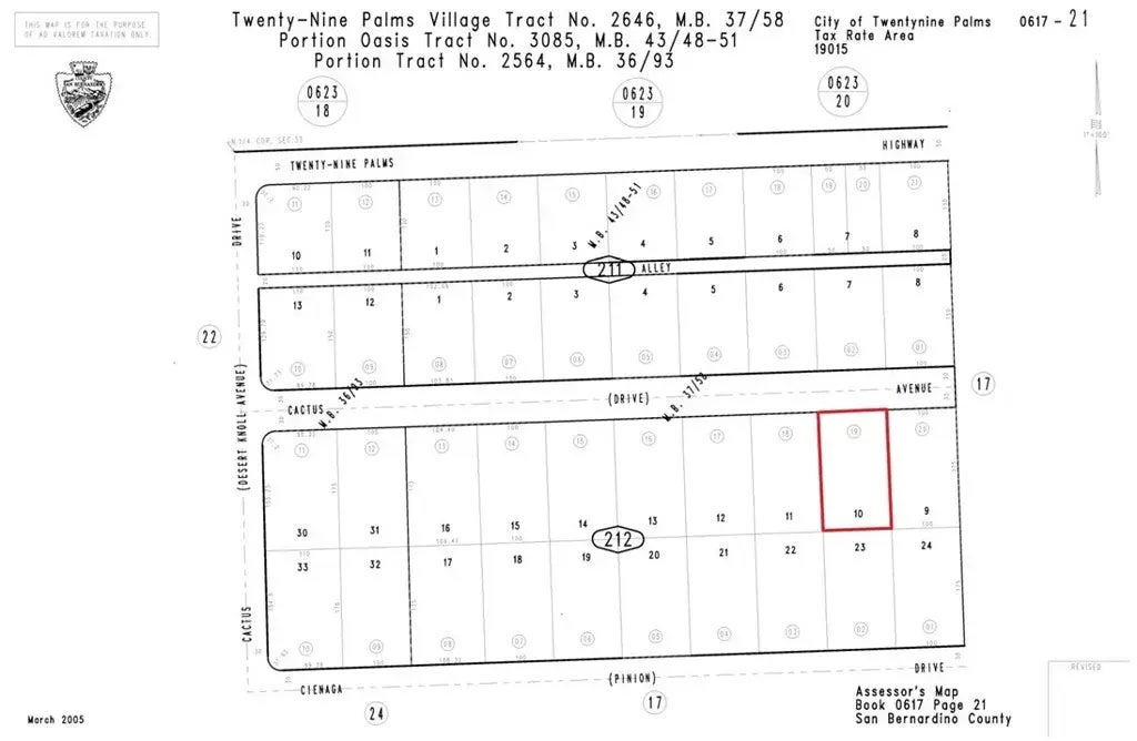APN: 0617-212-19-0000 Coordinates: 34.134556, -116.042556 17,500 SqFt lot for sale in 29 Palms. This parcel is located on Cactus Dr just off the main Highway in 29 Palms, CA. Nearby are other houses as well as stores and other amenities down the highway. Excellent location to build a home.