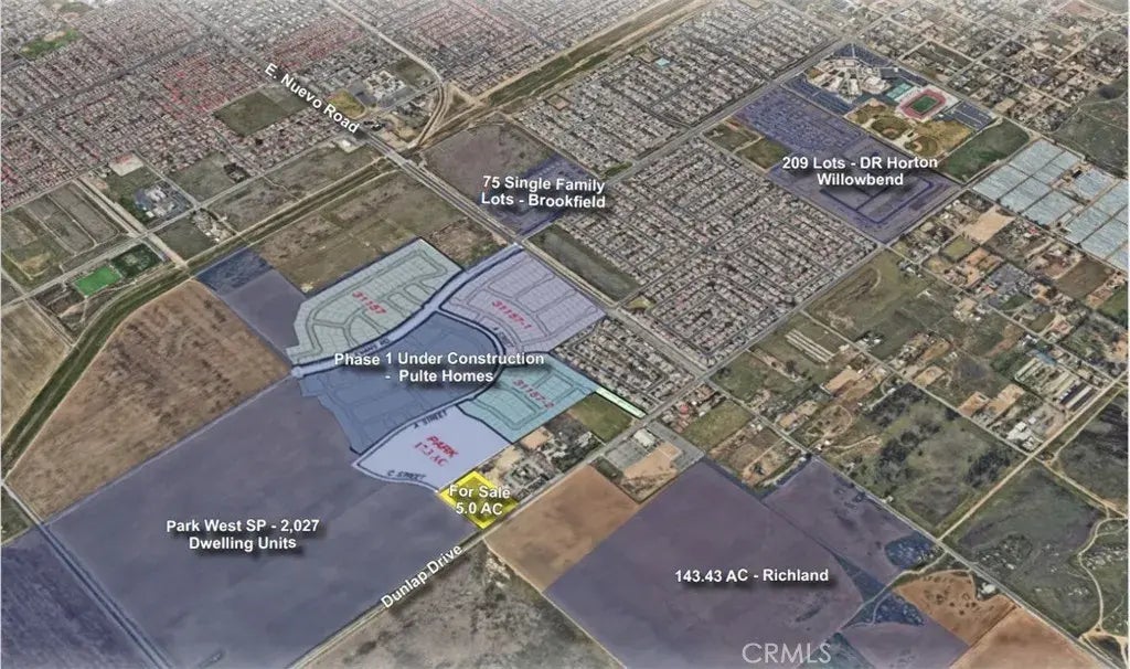 The subject property consists of approximately 5.0 acres of raw land on Dunlap Dr located just south of Nuevo Rd in the City of Perris, one of Riverside Countys fastest growing cities. The property has an expired TTM for 60 Townhouse Units with 370 feet of frontage along Dunlap Dr. The property is approximately 3 miles from I-215 at Nuevo Rd where there is a large commercial presence. Immediately to the west and to the south of the property is a large 534 acre property known as the Park West Specific Plan. This plan calls for 2,027 total residential units for a gross density of 3.8 DU/AC. The first phase of this development has already been sold to Pulte Homes who is actively building homes in the community. See the Surrounding Development Map included on the following page for additional insight on the area. The site has access to water along Dunlap Dr with sewer access available at the newly built church to the north on Dunlap Dr per the Eastern Municipal Water District. Additionally, Pulte Homes is currently installing sewer within Park West Dr which may also be a connection point for future development.