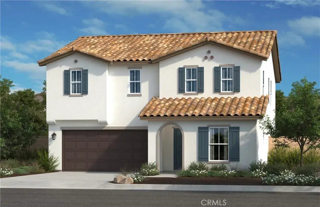 Beautiful Poppy community-Spanish Style all electric two-story home. Includes 4 bdrm, 3 baths, and a loft. Spacious great room. Kitchen boasts beautiful quartz counter tops, white cabinets and Energy Star Certified Whirlpool dishwasher, electric range and microwave hood combo. Vinyl plank flooring throughout downstairs. Large primary bedroom, walk-in closet, walk-in shower, and laundry room upstairs. Solar w/choice to lease or purchase. No HOA. Future community central park, which will feature ball fields, a basketball court and play equipment. Minutes to I-215 via Hwy. 74. Walking distance to local elementary and high schools. Shopping and dining nearby at Menifee Countryside Marketplace and Menifee Town Center. Adjacent to Marion V. Ashley Community Center and Park, which offers a gymnasium, fitness trails and picnic and play areas" Short distance to Lake Perris. Photo is a rendering of the model. Buyer can either lease or purchase the Solar.