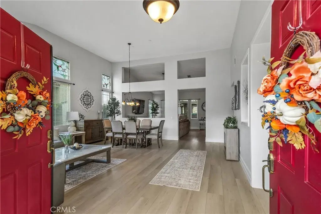 Welcome to the only single-story home currently available in the highly desirable Hunters Ridge, where breathtaking views of the mountains and city lights set the scene for elevated living. This turn-key residence greets you with an inviting front porch and elegant double door entry leading into a grand foyer. Inside, you'll find refined touches like crown molding, premium plank flooring, recessed lighting, and a formal living room that flows seamlessly into a dining area. The expansive open-concept layout showcases a versatile office/flex room. From prep to plating, this kitchen makes every step of cooking enjoyable, featuring a double oven, 5-burner stove, kitchen island with breakfast bar, all overlooking a cozy family room complete with a fireplace. The spacious owners suite offers a private retreat with direct access to the covered patio, a walk-in closet with built-in organizers, and a luxurious bathroom complete with a soaking tub, dual vanity sinks, and a walk-in shower. A separate laundry room adds convenience with abundant cabinetry and sink. Step outside to enjoy the above-ground gazebo spa, Aluma-wood patio cover, and beautifully landscaped yards with artificial grass and a tranquil koi pond with a soothing waterfall feature. With no neighbors behind, privacy and serenity are yours to enjoy. Modern upgrades include a 2024 electrical panel with a 50Amp EV car charger, a newer shed with workbench and shelving, a 7-year-old 5-ton A/C unit, and a finished garage with epoxy flooring. The wide driveway and gated RV access provide ample parking, while the quiet neighbo