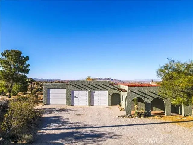 BACK with a BETTER PRICE! BEST LOCATION--the Joshua Tree Highlands--enchanting Desert Haven! Situated in one of Joshua Trees most desirable locales, this sun-kissed 2.5-acre oasis, nestled at the base of jutting hills and ensconced in desert wilderness, enjoys sweeping panoramic views. Offering practical comforts in a well-appointed setting, this spacious 2-bedroom, 2-bathroom home with bonus guest quarters encompasses nearly 1,600 square feet of living space. Recently renovated, it now showcases contemporary tile flooring, upgraded bathrooms, and stainless steel appliances, striking quartz countertops, modern cabinetry, and a welcoming breakfast bar with pendant lights that infuses the chef's kitchen with a clean, sophisticated ambiance. Also upgraded to include a powerful and energy-efficient mini-split HVAC system, ensuring year-round comfort! The kitchen seamlessly flows into a large entertainment space, where the dining and living areas enjoy natural light streaming through a bank of windows. This vision continues with charming built-in cabinets and shelves, along with a cozy wood-burning stove that provides a perfect respite during the winter evenings. Indoor / outdoor living a plus! The covered deck and expansive concrete patio offer ample room for gatherings. This property presents the ultimate in storage options, with an attached 2-car garage, an additional 2-car garage, a spacious two-door 800 sq foot studio workshop or RV storage, as well as a steel shipping container. Whether you are an enthusiast or simply require extra space, this home has it all. An electric
