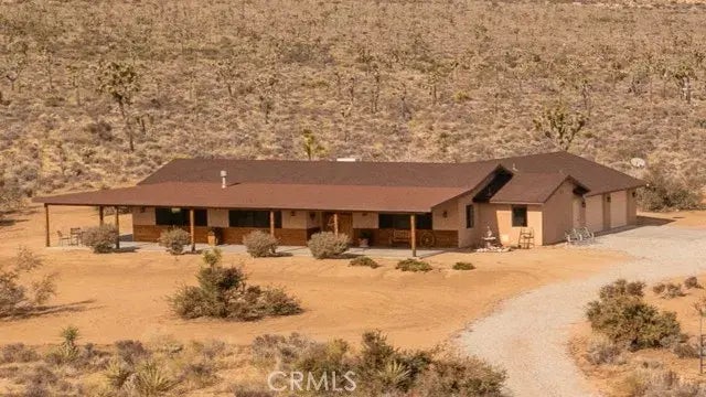 PRICED TO SELL: Two homes on one Lot, with the original homestead and custom build Ranch This custom-built Western Ranch house features a beautiful wrap-around porch, and large picture windows overlooking the canyon. Every window of this home displays breathtaking views of the desert filled with Joshua trees. Enjoy morning coffee on the wraparound deck and evening cookouts in the outdoor kitchen on the patio and attached 3-car garage. The wildlife-friendly environment adds to the allure of this ranch where you can observe and appreciate the local flora and fauna. Embrace the desert's serenity, the canyons' allure, and the Indigenous landscape - It's all here at Cottontail Ranch located in Historic Pioneertown! The main house is a 1772 sf, 2 bedrooms with 2 full baths on 5 acres. Enter the home to find open wood beam ceilings and a cozy wood-burning stove; the dining area displays the scene through extra-large windows and new wood flooring. Beautiful wood French doors lead to the Primary Bedroom with an ensuite bath. Here you will find double sinks, a walk-in shower, and a soaking tub. The second bedroom is spacious with a walk-in closet and attached full bath. The kitchen has modern appliances and an eating bar and off the kitchen, a separate laundry room has direct access to a private jacuzzi yard. Next, you will find the Original Homestead Cabin with a full kitchen, sleeping/living room, and bathroom - a perfect guest house or mother-in-law cottage. Nearby are the horse corrals with a Shade cover, a large tack shed, and a private well with two holding tanks This property
