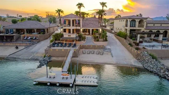 Escape to your own Private Retreat at this Stunning Waterfront Property! Breathtaking, Panoramic Views of the Colorado River, a Private Launch Ramp, Jet Ski & Boat Dock and Perfect Sandy Beach! Enjoy the gorgeous sunrise and sunset skies from the balcony, or down below at your very own Tiki Bar! A built in barbecue area sits right off the large, full length, covered patio- perfect for entertaining! The main home on this 1.24 Acre property features 4271 Sq ft, 4 bedrooms and 3 bathrooms. The kitchen is a cooks dream with its expansive layout, oversized island, granite countertops, gorgeous stone surroundings, and commercial gas stove. A wrap around breakfast bar gives extra seating, open to the dining space. Dining and living room have large picture windows to look out at the picturesque water views! A stone fireplace and matching dry bar gives elegance and ambiance to the living space. Gorgeous warm tones throughout this home with custom wood cabinetry and wood doors throughout. A romantic master suite features a large fireplace, dry bar, and steps out a private balcony. Youll also find dual sinks, walk in shower with dual shower heads and oversized jacuzzi tub. Two garages on the property, one equipped with a bathroom, second laundry and a pull through bay straight to your very own launch ramp. The guest house above the garage features 1380 Sq ft, 3 bedrooms, 1 bathroom, kitchen living room, and a patio/balcony with built in, brand new, barbecue and beautiful views! Enjoy sun all day and the ultimate shade in the afternoon on warm summer nights! Dont miss this opportunity