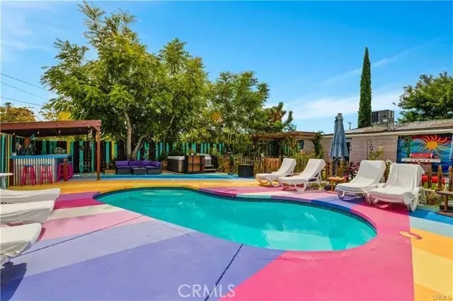 Unique Yucca Valley Oasis - Fully Furnished Pool Home and successful short-term rental. Gross income generated from March 2024 through August 2024= $39,350!! Dive into a world of unmatched creativity and comfort with this one-of-a-kind Yucca Valley home, where every corner tells a story of impeccable taste and distinctive flair. Backyard Paradise: Step into a visual spectacle, adorned with imaginative murals, vibrant paintwork, and a myriad of whimsical touches. The Tiki bar, powered and ready for evening soirees, stands adjacent to the refreshing above-ground spa, making it perfect for both daytime lounging and nighttime festivities. Rinse off under the intricate tile outdoor shower or simply relax under the pergola. The lush landscape bursts with mature flora, including delectable fruit trees, ensuring a slice of Eden at your fingertips. Embrace complete tranquillity with the entire yard surrounded by a privacy fence, promising a serene retreat away from the hustle and bustle of daily life. In the front yard, An expansive sliding gate welcomes you in, with an additional entrance specifically for trailers or RVs. Bask in the lushness of artificial turf that not only uplifts the property's aesthetic appeal but also promises year-round greenery without the hassle of maintenance. Journey inside to discover 3 enchantingly themed bedrooms, each with its own tale to tell. Two immaculate bathrooms await, with the newly added one boasting an expansive tile shower, dual sinks, and a separate toilet room equipped with a TV luxury and entertainment in one! The enclosed patio doubles