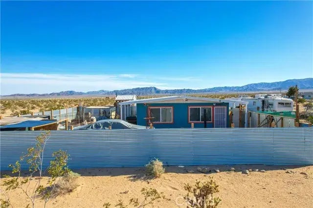 Welcome to a Hi-Desert oasis nestled in breathtaking Wonder Valley! This off-grid retreat sits on an expansive 5-acre lot, surrounded by sweeping desert views and majestic mountains stretching as far as the eye can see. With a prime location just off a paved road, this cabin offers the perfect blend of accessibility and seclusion, making it an ideal spot for those seeking peace and solitude. As you arrive, you'll be struck by the stylish corrugated steel fencing in the front, paired with perimeter fencing around the cabin for added privacy and security. Inside, large windows flood the space with natural light, creating an open and airy ambiance throughout the home. The cabins character shines through with features like wood laminate flooring, exposed wood beams, modern lighting, and trendy wood paneling. Every inch of the cabins square footage is thoughtfully utilized. The kitchen is efficiently laid out with minimalist shelving, white cabinetry, and a refrigerator, offering everything you need in a compact yet functional space. The Murphy bed is a clever addition, allowing you to easily transform the living area into a cozy sleeping space perfect for a restful night's sleep in the tranquil desert environment. Step out onto the back patio, an ideal setting for BBQs or evening dining under the starlit sky. Theres even an outdoor steel tub for a unique, rustic soak in nature. The recently remodeled bathroom features a full tub, shower, vanity, wood laminate floors, and stylish wood paneling, bringing a touch of luxury to this desert hideaway. Living off-grid is made simple wi