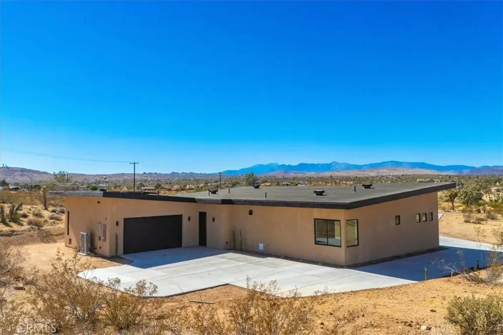 Brand new, stunning modern home in Joshua Tree area, perfectly combines contemporary design with desert serenity. This custom-built butterfly roof home sits on 2.09 private acres with convenient access via a concrete driveway. Crafted by renowned local builder Darrell Danielson, who brings over 40 years of expertise, the brand-new property features sleek, energy-efficient elements throughout. The kitchen is a chefs dream, with a quartz waterfall island, custom European-style cabinets, a wine fridge, and top-of-the-line appliances. The open great room boasts high ceilings, polished concrete floors, and a lineal electric fireplace, with giant sliding doors that offer breathtaking views of Pipe Canyon and the San Gorgonio Mountains. In the bathroom, you'll find a spa-like experience with a soaking tub, walk-in shower, and a luxurious rain downspout. Every detail has been thoughtfully designed, including 8-foot doors, a spacious slider, and an insulated 8' garage door, all complemented by a concrete driveway that ensures easy access off a paved road. This energy-efficient home, equipped with high-efficiency AC and appliances, captures the natural beauty of the Joshua Tree area. Whether you're looking for a serene vacation home or a peaceful full-time residence, this property offers the ultimate desert retreat.