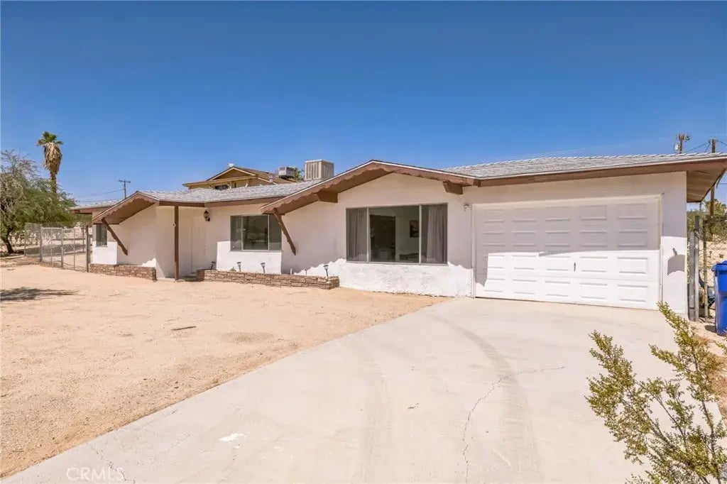 Looking for a charming desert home or investment property? Look no further! Nicely situated on .59 acres of land, this lovely 2 bedroom, 1 bath house features 1,174 sqft of living space with a desirable floor-plan, an attached 1 car garage & numerous upgrades throughout. The front door opens to a spacious living room adorning warm wood-like laminate flooring and large windows that let in an abundance of natural light. Just off the living room is the formal dining room and kitchen which is complete with beautiful quartz countertops, ample cabinet space, stainless steep appliances and tasteful backsplash. There is also a sizable bonus room that can be used as a family room, den, game room, office space etc! Not to mention, this home's neutral color palette makes it extremely versatile for any decor and style. Outside you'll find plenty of space to expand, add a pool or simply relax around a firepit on a starry desert night. Located on a quiet street just minutes from downtown, schools, restaurants, shopping, the marine corps base, Joshua Tree National Park & more! Come take a look & let this home's charming allure do the rest. Your new desert home, investment property or weekend retreat awaits!
