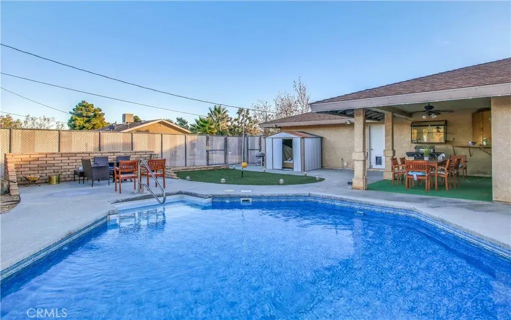 Welcome to your desert oasis! This charming 2-bedroom, 2-bathroom POOL HOME sits on a generous 0.34-acre lot in the centrally located Airport area of Yucca Valley. With its spacious layout, stylish updates, thoughtful features, and inviting backyard retreat, this property is perfect for comfortable living and entertaining. As you arrive, youll be greeted by a covered front porch, ideal for relaxing and taking in the peaceful surroundings. Step inside to discover a huge living room filled with natural light from large windows and adorned with wood-look flooring for a modern yet cozy feel. The kitchen is a chefs delight, boasting granite countertops, ample cabinetry, a pantry, and a full tile backsplash. Open to the dining space, its perfect for hosting meals and gatherings. An additional oversized living area features a welcoming fireplace and sliding glass doors leading to the backyard, offering seamless indoor-outdoor living. The primary bedroom is spacious and bright, complete with an attached bath featuring tile counters and a tiled tub/shower combo. The second bedroom is equally roomy, with a walk-in closet and easy access to the updated guest bath, which includes tile counters and a stylish tile tub/shower combo as well. Practical features abound, including an attached 2-car garage with convenient laundry hookups. The real showstopper, however, is the fenced backyarda true desert oasis! With a covered porch, an inviting in-ground pool, and plenty of space for lounging, gardening, or entertaining, its the ultimate retreat. Conveniently located near local amenities, dini
