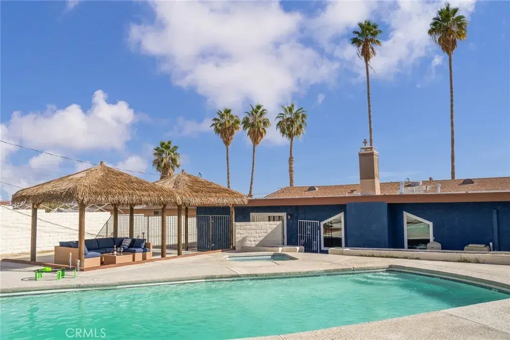 This beautifully updated 3-bedroom, 2-bathroom pool home sits on a spacious 0.62-acre lot in the sought-after Chocolate Drop neighborhood of 29 Palms. With fresh exterior paint and a custom Tiki Hut, the outdoor space is perfect for relaxing by the newly upgraded pool, complete with a modern filtration and cleaning system. Inside, the home features all-new double-paned, self-locking Milgard windows, a new sliding glass door, and Ring floodlights with security cameras for added convenience and peace of mind. The interior has been thoughtfully updated with new drywall, fresh paint, and stylish laminate flooring throughout. Energy-efficient mini-split systems in every room ensure personalized climate control, while recessed lighting, crown molding, and custom blinds add a touch of elegance. A brand-new front door completes the home's modern yet inviting aesthetic. Currently operating as an active Airbnb, this home is just 8.5 miles from Joshua Tree National Park and minutes from the vibrant downtown 29 Palms, making it an ideal investment or a lovely home.