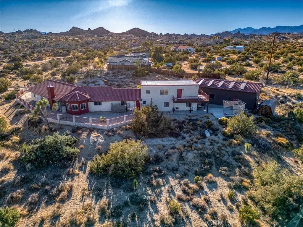 Welcome to this stunning estate in the exclusive Rancho Mesa area of Yucca Valley. Set on over 2.4 acres, this 6-bedroom, 4-bathroom property offers everything you could dream of in a home. Upon arrival, youll notice the property is fully fenced, with a beautiful wrought iron gate welcoming you to the home. The main house boasts a spacious layout with soaring high ceilings in the living room, a cozy fireplace for those chilly desert nights, and an open, airy feel perfect for relaxing or entertaining. The home is thoughtfully designed, with three bedrooms and three bathrooms in the main living space. It also features a shared family room that connects seamlessly to a Three-bedroom, one-bathroom guest house. The guest quarters offer its own private living room and a wraparound balcony with spectacular views of the desert and surrounding mountainsan ideal retreat for extended family or visitors. This property also caters to those who value energy efficiency and practicality. The paid-off solar system is a major highlight, located on a detached RV garage that provides incredible space for car enthusiasts, hobbyists, or anyone with big projects. To ensure uninterrupted convenience, the seller has installed a Generac backup power system, which will keep everything running smoothly during utility outages. The main house also includes a spacious 3-car garage with plenty of additional storage. With its breathtaking views, ample amenities, and thoughtfully designed spaces, this estate has so much more to offer. Words cannot fully capture the charm and functionality of this home. Sche