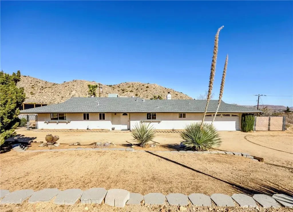 Recent PRICE IMPROVEMENT-Welcome to your dream home in the highly sought-after Juniper Terrace neighborhood of Yucca Valley! This charming 3-bedroom, 2-bath residence boasts an inviting Open Floor Plan with Spacious Rooms adorned with 18-inch Tile and Ceiling Fans for added comfort. Enjoy cozy evenings by the Wood Fireplace with Insert, or stay cool during the warmer months with Forced A/C and/or 2 Efficient Evaporative Coolers. The home features a convenient Attached 2 Car Garage and a Separate Laundry Room, making daily tasks a breeze. Step outside to discover a Fully Fenced Side and Backyard, perfect for outdoor gatherings against the backdrop of Stunning Views. With an Exterior 100 amp Sub Panel and an abundance of Nearby Hiking Trails, this home offers both functionality and a connection to nature in a tranquil setting. Dont miss your chance to own this gem in a Quiet Neighborhood!