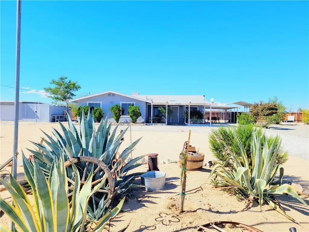 Talk about a Desert Oasis, this is it! Large, beautifully landscaped house with great unobstructed views. Patios on all sides. Three bedroom two bath home features large master bedroom with large patio outside sliding glass door. Two medium size bedrooms one having its own patio. Large open-concept living room, bonus room, and kitchen. Living areas are serviced by Air conditioning/heat from cozy pellet stove and mini split wall units. U-shaped kitchen with all modern appliances. Large laundry room with large front load washer and dryer. The best part of this home is it is completely furnished right down to the silverware. There is also a garage and outbuilding with fencing all the way around. This is a must see home.
