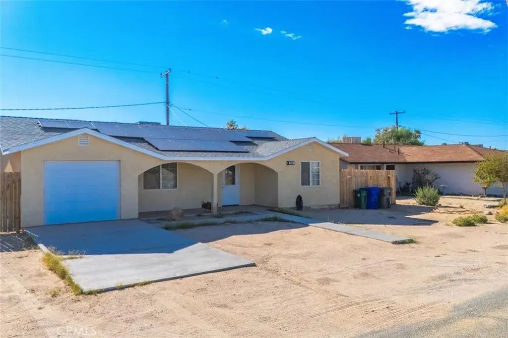 Seller has VA Assumable LOAN of 5.5% interest rate!! Discover a rare gem in the heart of 29 Palms, located in the vibrant Four Corners district. This 3-bedroom, 3-bathroom home offers a unique living experience with each corner of the house featuring its own bathroom, ensuring both privacy and convenience. The spacious 1,424 square-foot layout is perfectly complemented by a 7,200 square-foot lot, providing ample outdoor space. The home is equipped with modern comforts, including central air conditioning and heating, ceiling fans throughout, and essential appliances such as a washer, dryer, and a new water softener which is $85 per month. A recent addition is the Solar System with a Tesla Battery Power Wall, a purchased system that enhances energy efficiency for $305 a month. Enjoy the ease of a one-car garage and the unbeatable location just steps away from local favorites like Kitchen in The Desert, Out There Bar, The Ramsey Hotel, and Blockhaus. The vibrant, evolving neighborhood offers a rich blend of community and convenience, all within walking distance. For nature enthusiasts, the entrance to Joshua Tree National Park is just a 5-minute drive away, making this home an ideal choice for those looking to immerse themselves in the dynamic spirit of 29 Palms.