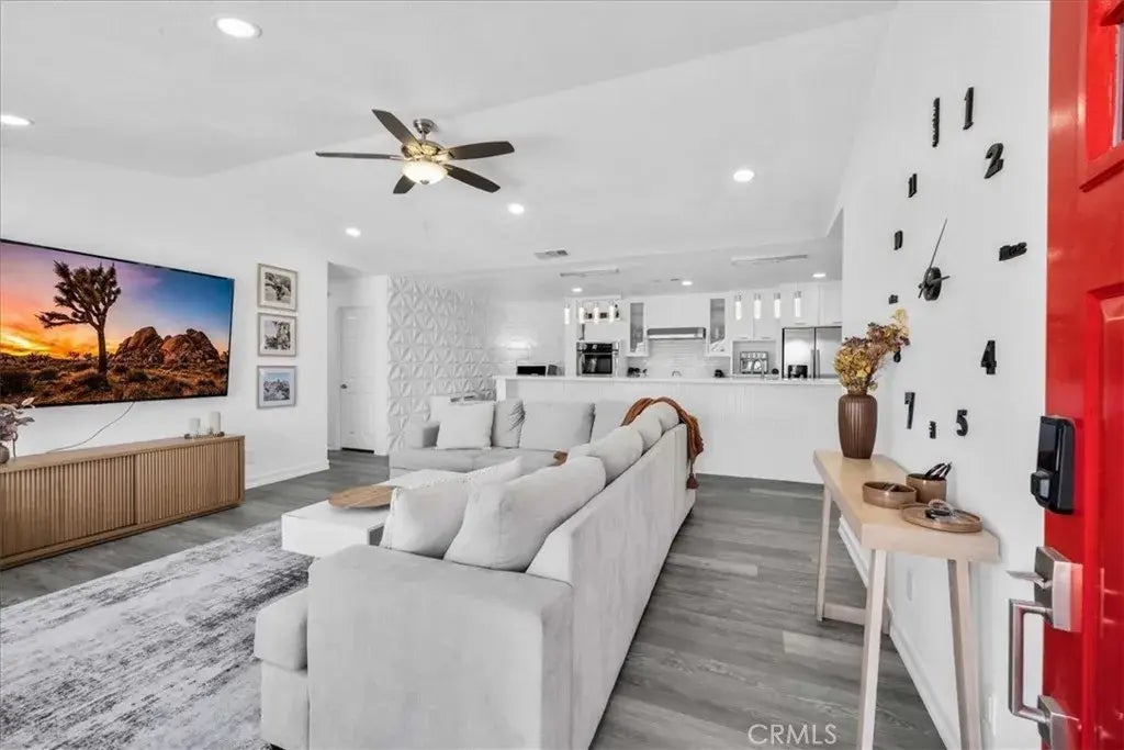 FULLY PAID SOLAR!! Welcome to 7068 Eucalyptus Ave, a gorgeously upgraded home in a quiet neighborhood with STUNNING Mountain Views! This picture perfect home features 1,607 sqft of living space with 3 bedrooms, 2 bathrooms, a convenient indoor laundry room & an attached/finished 2 car garage (its modern style and spacious floor-plan is one to be desired). As you step inside you're greeted with a bright and airy open-concept living space boasting high ceilings, modern wood-like flooring, recessed lighting and a large east facing window that lets in an abundance of natural light. The living room flows effortlessly into the kitchen area complete with an oversized island with beautiful quartz countertops, stainless steel appliances (including a double oven), slow-close cabinets, ample cabinet space and a large walk-in pantry. Just off the kitchen is the formal dining room anchored with a lovely gas fireplace and double French doors that lead to the back patio. All 3 bedrooms feature ceiling fans and recessed lighting while the primary bedroom adorns an electric fireplace for added ambiance, a mini-fridge & microwave (perfect for movie nights!), it's own private access to the backyard and an ensuite bathroom with a dual sink vanity & a spa-like walk-in shower. Outside you'll be delighted to find a fully fenced yard with a covered patio and gazebo with built-in bar seating, a storage shed, a double gate opening for RV parking and plenty of space to entertain or relax around a firepit on a starry desert night. Conveniently located close to downtown 29 Palms, shopping, eateries, sc