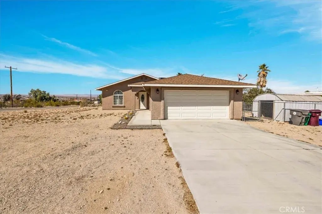 Nestled in the desirable Hanson area of 29 Palms, just minutes from the entrance to Joshua Tree National Park, this charming 3-bedroom, 2-bath home offers stunning mountain views and a serene desert setting. Situated on nearly a third of an acre, this property features an attached two-car garage and fresh paint inside and out, ensuring a move-in-ready experience. Step inside to a spacious open-concept living and dining area, where high ceilings, abundant natural light, ceiling fans, and stylish wood-look flooring create a welcoming atmosphere. The kitchen seamlessly connects to the main living space and boasts stainless steel appliances, including a gas stove, ample cabinetry, and generous counter space with classic tile countertops. A sliding glass door leads to the backyard, offering easy access to outdoor enjoyment. The primary bedroom is a peaceful retreat with its own sliding glass doors to the outside, a spacious en-suite bath featuring dual sinks, a tub/shower combo, and a private commode room. Both guest bedrooms are well-sized and bright, providing comfortable accommodations for family or visitors. The second bath is also thoughtfully designed with a tub/shower combo. There is also an indoor laundry room for your convenience. Enjoy the beauty of the desert with breathtaking sunrises and star-filled night skies, all while being close to local amenities, the Marine Corps base, and the incredible outdoor adventures of Joshua Tree National Park. This well-maintained home offers the perfect blend of comfort, style, and prime location and comes FULLY FURNISHEDdont miss t