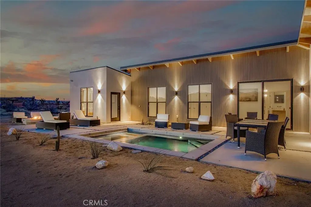 Experience the pinnacle of modern desert living with this stunning new construction, set on over 2 acres of pristine land with commanding views of Joshua Tree National Park's ridgeline. This exceptional property combines contemporary design, luxury finishes, and a tranquil desert backdrop, creating the perfect private retreat. Thoughtfully curated from the high-end finishes to the spacious layout and even the fire-resistant metal roofing. Additional features include large-format tile flooring throughout, quartz countertops, and a split floor plan designed for ultimate privacy the main en-suite bedroom occupies the west wing, a serene haven flooded with natural light, while the open-concept kitchen and living area occupy the east side, offering a perfect space to entertain or relax. Step outside to a south-facing courtyard, with the pool and spa framed by expansive mountain views. Built for both beauty and efficiency, with its metal roof, paid solar system, and a concrete driveway. A covered carport adds utility, while the fully furnished, turnkey setup ensures a seamless transition for its new owner. Located in a peaceful, rural setting, this property provides the solitude while being just minutes from dining, shopping, and the hospital. Explore nearby desert trails, discover the ancient dry lakebed nearby, or simply enjoy the quiet luxury of your own private retreat. Whether youre seeking a vacation rental investment or a primary residence, this home offers the ideal blend of style, comfort, and functionality. Every element, from the interior to the outdoor spaces, has be