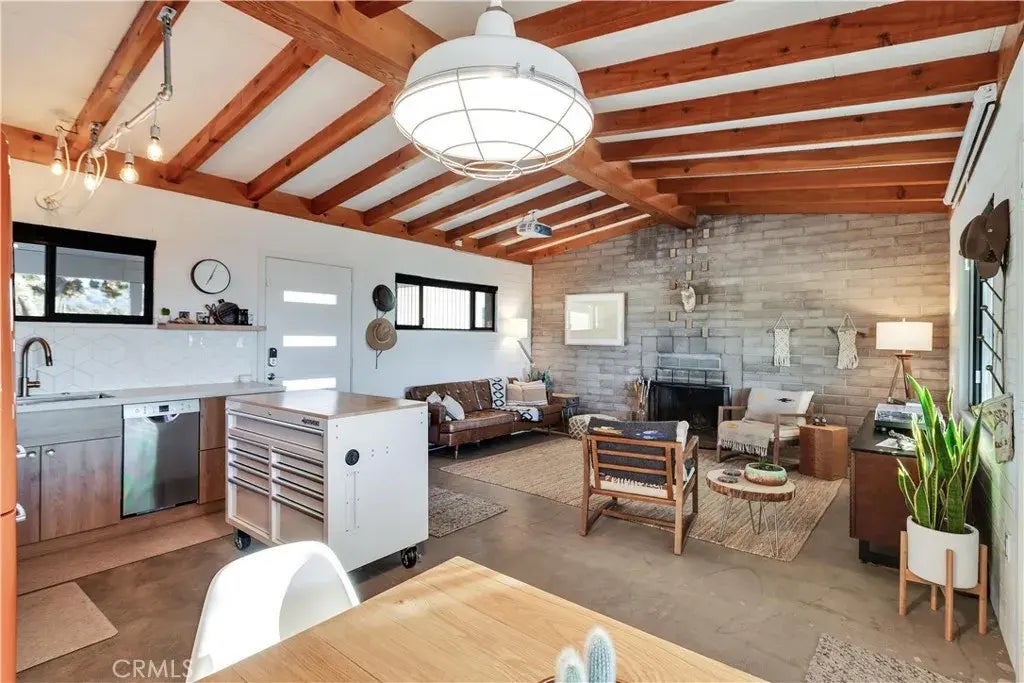 Owned Solar! Charming Mid-Century Desert Getaway in Covington Flats!! Welcome to your ultimate desert escape in enchanting Covington Flats! This is a rare find in the high desert, with amazing hiking at your doorstep, but also located just minutes from shopping, dining, and the entrance to Joshua Tree National Park. Nestled on a massive 5 acre lot, this beautifully renovated home is ready to go! With dual pane windows, a full solar system with backup batteries, and energy-efficient mini-splits, this home combines luxury living with sustainability. Pulling up to the grounds youll be captivated by the view as you take in the gorgeous desert landscape that rivals most paintings. As you walk through the front door you'll find a seamless blend of 1950s character and modern luxury. Stunning vaulted wood beamed ceilings along with the original masonry and wood burning fireplace set the mood. Exposed concrete flooring sweeps through the living area with well-placed windows bringing in natural light and creating an open and airy feeling throughout. Designed perfectly for entertaining, the kitchen opens up to the dining and living area and features modern kitchen cabinets, island, stainless steel dishwasher, oven, hood, and hip Smeg refrigerator! The oversized master bedroom is truly spacious with ceiling fan, dual closets, and private access to the covered patio. And the exquisite master bathroom will blow you away with a modern dual vanity, spacious walk-in shower and laundry area. The guest bedroom offers picturesque views from each window along with stylish fixtures, while the gu