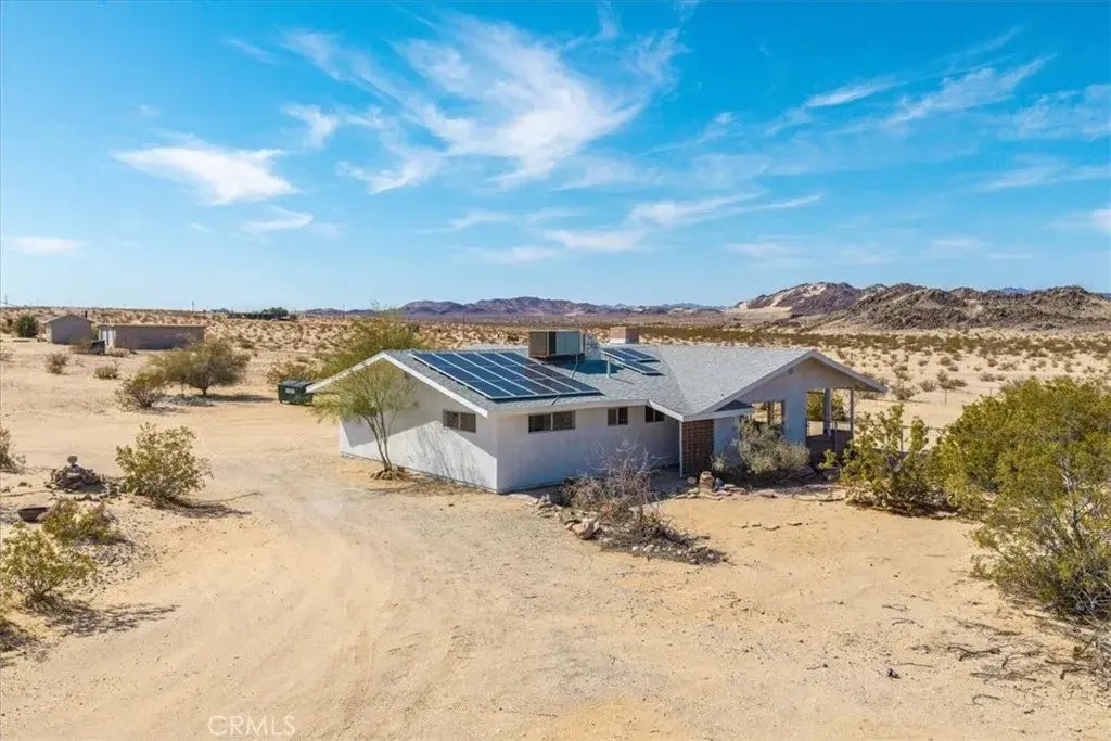 Step into timeless style and desert charm with this beautifully updated 3-bedroom, 2-bathroom mid-century gem. Spanning 1,439 square feet, this home boasts polished concrete floors throughout and floods of natural light that highlight its clean, modern aesthetic. At the heart of the living room, a classic brick fireplace adds warmth and character, creating the perfect space for cozy evenings. The fully renovated kitchen is equipped with a brand-new refrigerator and stylish finishes, ideal for cooking and entertaining. Enter through stylish breeze blocks and discover spacious bedrooms, including a primary suite with its own private bathroom. Both bathrooms have been thoughtfully upgraded with terra cotta tile and modern shower features, blending comfort and design seamlessly. Outside, this 10-acre property offers wide open skies and unmatched views of the Godwin Mountains. Enjoy breathtaking sunrises and sunsets from the back patio, and take full advantage of the fenced-in backyard perfect for pets or privacy. The two-car garage with washer /dryer includes a back workspace, adding functionality to your desert dream. Central heating and air conditioning keep the interior comfortable year-round, while PAID SOLAR ensures energy efficiency and low electric bills. The front yards iconic saguaro cactus and thoughtful landscaping make a lasting first impression as you arrive. This Wonder Valley home checks every box and is priced to move dont miss your chance to own this slice of desert paradise.