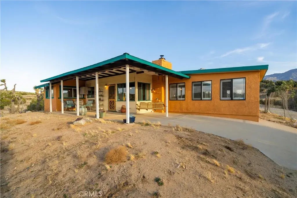Discover a delightful off-grid bungalow nestled in the hills of the high desert! This charming hilltop home features 2 bedrooms and 3/4 bath, set on a spacious lot with breathtaking views of the San Gabriel Mountains. The property is adorned with lush desert vegetation, ensuring low-maintenance landscaping. Inside, the home radiates warmth with wooden beams gracing the ceilings throughout. The living area boasts a stunning Waterford wood-burning stove from Ireland, while the kitchen offers ample cabinet space and beautiful polished granite countertops. Large windows fill the space with natural light and showcase the picturesque views. Retreat to the expansive primary bedroom, painted in cheerful hues that enhance the home's brightness, complete with elegant plantation shutters. The second bedroom is a true gem, featuring its own fireplace and shelves perfect for a small library and a cozy nook for your bedideal for any reading enthusiast! Escape the hustle and bustle of city life and find tranquility in your own serene hideaway! Say goodbye to high electricity and water bills, as this home is powered by a high-quality paid-off solar system, with water sourced from its own well and propane for gas. The laundry room is conveniently located in a separate shed, and the property also includes an impressive partially underground building, perfect for storage or as a workshop. Prepare the grill and grab your favorite drink to savor all that nature has to offer on the covered patioit's an ideal spot to soak in the enchanting desert sunrises and sunsets! Don't miss out on this charm