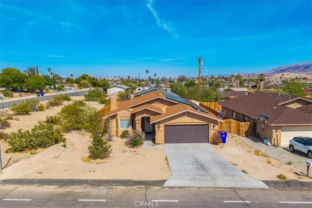 This lovely 4 bedroom, 2 bath home is nestled on a generously sized lot, centrally located in the Chocolate Drop area of 29 Palms. Built in 2012, the property also enjoys many thoughtful recent upgrades, including new flooring, new baseboards, new dishwasher, new water heater, new water softener, and fresh paint throughout. The home is also outfitted with FULLY PAID SOLAR! As you approach the property, you'll appreciate the paved concrete driveway leading up to the attached 2 car garage, as well as the inviting stucco facade and pleasant landscaping. Stepping inside, you'll encounter a large open concept main living area with new floors, high ceilings and a fireplace for ambience and supplemental heat. The kitchen is a chef's dream with granite countertops, stainless steel appliances (including gas stove), and lots of bright cabinetry for storage. The primary bedroom invites you to kick back and relax with wood-look flooring, ceiling fan, a sizable walk-in closet, and an attached bath with dual sinks, granite countertops, and BOTH a walk-in shower and a separate garden tub wow! Each of the guest bedrooms is nicely sized and well lit, and enjoy their own ceiling fans and ample closet space. Meanwhile, the guest bath features more granite countertops and a glass doored tub/shower combo. The home also has an indoor laundry room for your convenience. Step outside the sliding glass doors to encounter a well maintained backyard that is surrounded in wooden privacy fencing. There is a shaded brick patio, plenty of space for kids and pets to play, as well as a shed for storage. Al