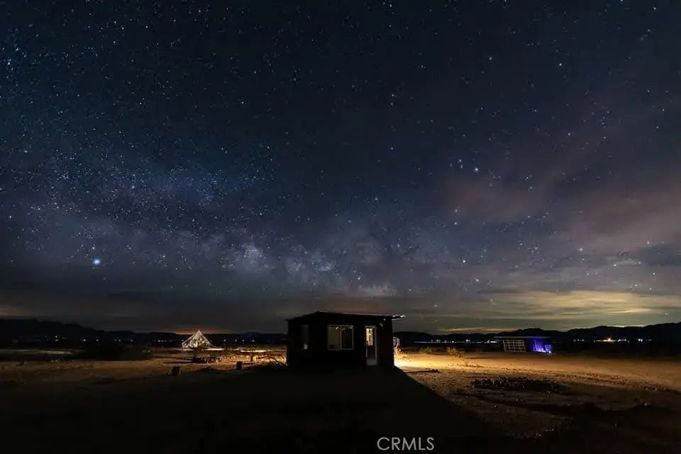 This is a unique remodeled cabin with an enclosed garage secondary living space. Many possible uses for this property. Perfect for artist retreat or desert getaway home. The five-acre parcel has six concrete slab spaces with dedicated parking. There is a toilet and three showers on septic system installed in 2022. The property is off grid with six 200 watt solar panels and batteries. It is hauled water with two separate 300-gallon storage tanks. The main cabin has recent metal roof that has been torched down for resistance to wind. Easy access from Amboy Road. Located just minutes away the Palms Restaurant. The stars at night and expansive vistas have to be experienced in person.