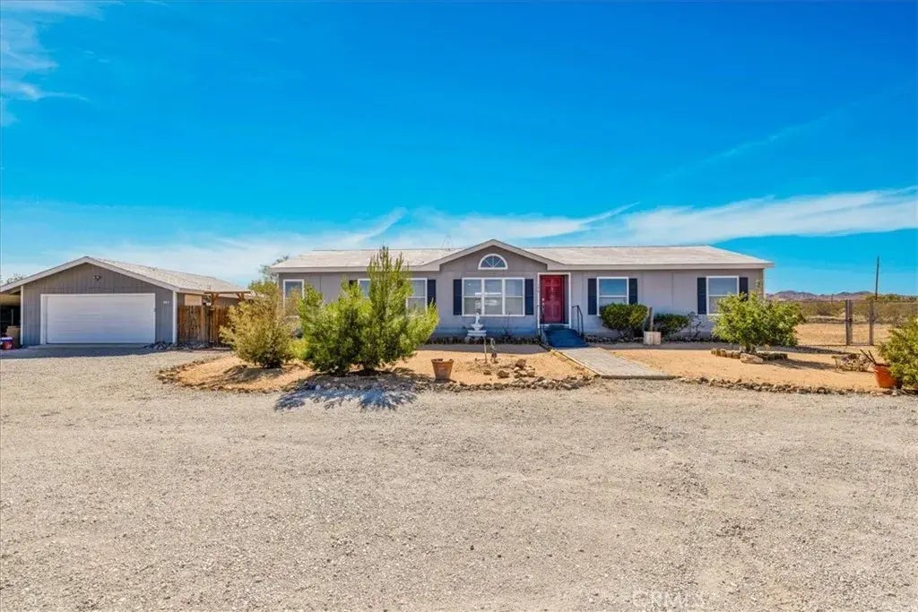 Welcome to your dream home in the tranquil East Flamingo Heights area of Yucca Valley with PAID SOLAR! This 4-bedroom, 2-bathroom manufactured home is situated on a sprawling 2.3-acre lot, this home offers 360-degree panoramic views that capture the stunning natural beauty of the surrounding landscape. The detached 2-car garage provides ample parking and storage space. Step inside to discover a spacious living room, adorned with a cozy fireplace and a built-in entertainment nook. You'll be pleased to know that the home boasts new paint and flooring throughout. The expansive kitchen is a chef's delight, featuring tile countertops, a full tile backsplash, an abundance of wooden cabinets, and stainless steel appliances, including a gas stove. The open-concept design connects the kitchen to the dining room, which boasts sliding door access to the back patio. The primary suite is a true retreat, complete with its own private sitting area, oversized windows that flood the space with natural light, a generous closet, and an attached bath. The primary bath offers dual sinks, a walk-in shower, and a luxurious garden tub, perfect for unwinding after a long day. The additional bedrooms are well-sized, bright, and equipped with ceiling fans for added comfort. The guest bath features a tub/shower combo and tile countertops, providing both style and functionality. Step outside to enjoy the shaded brick patio in the backyard, an ideal spot for relaxing or entertaining. Additionally, a separate air-conditioned and insulated outbuilding with power offers endless possibilities as a studio, h