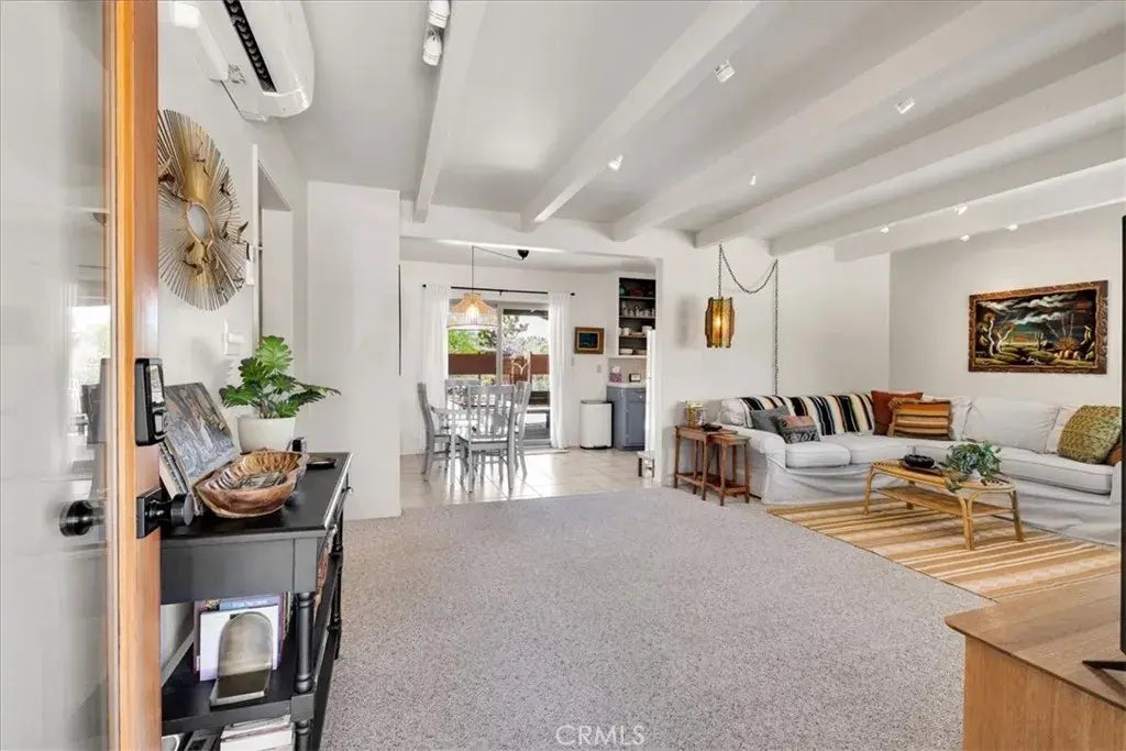 This stylish 2 bedroom, 1 bath home on just under half an acre in east central Yucca Valley offers modern comforts, thoughtful outdoor living, and a convenient location. A circular driveway and mature landscaping welcome you home, with an attached 2-car garage providing ample parking and storage. Inside, you'll find sleek modern finishes and a spacious main living area with beamed ceilings, large dual pane windows (found throughout the home), and a mini-split system for year-round comfort. You'll be thrilled to know the home also boasts new plumbing throughout. The open dining area connects seamlessly to both the living room and kitchen, featuring tile floors and sliding glass doors that lead to the inviting backyard patio. The kitchen includes tile countertops, generous cabinetry and shelving for storage, and a wall-mounted oven. Both bedrooms are comfortably sized, each with its own mini-split system for personalized climate control. The bathroom is sleek and functional, with tile counters and a tub/shower combo. Step outside to enjoy the thoughtfully designed backyard, perfect for relaxing or entertaining. Multiple covered patios and paved sitting areas offer shade and comfort, including an outdoor dining space. A cowboy pool sits on its own concrete pad with a sunning area, adding a refreshing touch to this high desert retreat. There is also a convenient outdoor shower. With space to enjoy and room to grow, this home blends comfort, style, and outdoor charm in a sought-after part of Yucca Valley. Book a showing to see this lovely home for yourself!