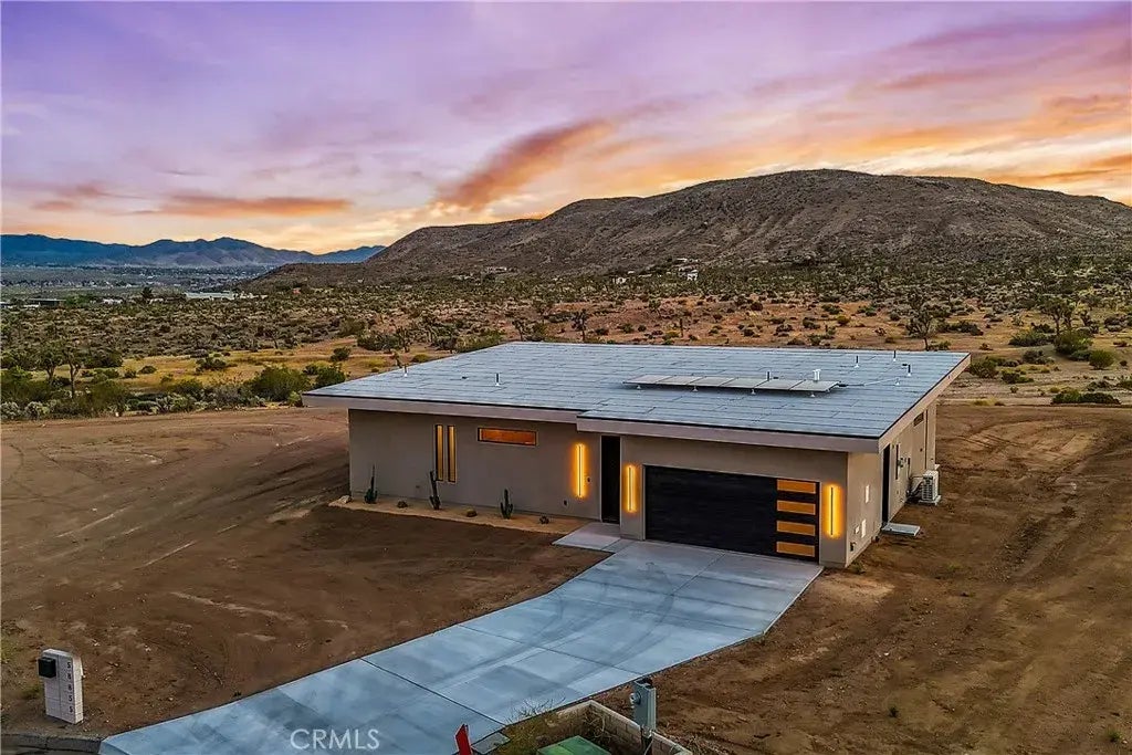 Discover serenity in this newly constructed 2-bedroom, 2-bath home with incredible Joshua Tree VIEWS! Situated on over 19000 square feet of pristine desert landscape, this contemporary abode offers a seamless blend of modern comfort and natural beauty. Step inside to be greeted by the inviting warmth of zoned heating and air, ensuring your comfort in every season. The sleek concrete flooring throughout exudes a sense of minimalist elegance, perfectly complementing the surrounding desert vistas. Enjoy cool evenings by your outdoor fireplace, or a cool shower on a hot summer night under the stars with your own outdoor shower! Embrace the ease of living with a convenient 2-car garage, providing ample space for storage or your vehicles. The primary bathroom boasts dual sinks and a luxurious walk-in shower, offering a spa-like retreat after a day of exploration. Home features paid solar, pre-wired speakers, camera system and hotpsot internet in every room. Experience the epitome of desert living with this thoughtfully crafted home, where every detail speaks to quality and craftsmanship. Enjoy breathtaking views from every angle, inviting you to unwind and savor the tranquility of your surroundings. Welcome home to a haven of modern sophistication and natural allure. Your desert oasis awaits.