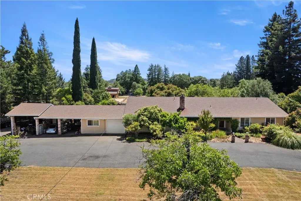 Located in a peaceful rural setting of what used to be walnut groves, this lovely remodeled 1970s ranch house features crown molding, an open floor plan with 4 bedrooms, 2.5 baths and an additional 1,000 sq. ft., two-bedroom, one-bath guest house could possibly be used as a rental or Air B&B. A large circle drive facilitates parking for entertaining. The entry to the main house opens into a music room/living room with a vaulted ceiling. Beyond the music/living room is the dining and family room which has a bank of windows and sliding glass doors overlooking the gardens and patio, allowing for easy overflow of entertaining to outdoors. There is a fireplace in the family room and wood stove in the kitchen. Chef's kitchen features a DCS stove with six burners, a griddle and two ovens, center island unit, granite counters with wood cabinetry and a walk-in pantry. Off the kitchen is a fourth bedroom or study connected to the half bath. The patio off the family room, features an inground pool with diving board, safety fencing, pump house and solar for pool. There is ample room for outdoor furniture for entertaining or relaxing. Owned solar contributes to utility bills and a new propane furnace with energy-efficient thermostat was installed in 2022. Numerous garden boxes provide growing space for a kitchen of herbs & vegetables, while others form the basis for a rose garden. En suite has French doors that open onto a private deck with views of the beautiful rose gardens and boasts a large walk-in closet, a jetted tub, double sinks and a walk-in shower. A variety of fruit & nut tre