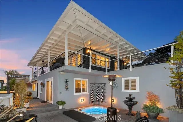 This stunning three bedroom, two bath home on a double lot has been tastefully updated throughout. The upper floor offers an open-concept layout, showcasing a large primary suite, combined with a lounge area, office space and bathroom. Multiple glass doors open to a large wrap-around deck, with custom wrought iron railings and whitewater ocean views. The entry level includes a living room, dining area, and remodeled kitchen with stainless appliances. Two additional bedrooms and remodeled bathroom completes the lower level. The backyard is an entertainer's dream, with a spacious Trex deck and a built-in private spa. There is a large grassy yard and separate private dog run. Plantation shutters on both levels, two A/C split units, electric drapes in primary suite, wood flooring throughout, indoor and outdoor surround sound, and epoxy garage flooring. There is lush landscaping and outdoor lighting around the property. This prime location is near Moulton Meadows Park, with basketball courts, tennis courts, a soccer field, kids play structures, and hiking and biking trails. Enjoy the Laguna Beach lifestyle in your new home !!
