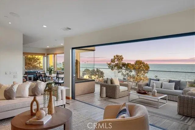JUST REDUCED! Dramatic Whitewater Ocean views take center stage in this spacious modern home. Ideally situated in North Laguna overlooking the blue Pacific and Catalina Island, this prime location provides stunning water views from nearly every room. Remodeled, expanded and re-imagined in 2004, more recent upgrades to this spectacular beach-close home include all new La Cantina folding glass doors from the living room to the expansive deck with glass panel railing, a downstairs covered patio with more water views, all new tile plank flooring inside and out, and new lush landscaping. Boasting an entry level primary bedroom with two additional bedrooms downstairs, custom kitchen with peninsula and adjacent outdoor coffee bar, and generous living rooms on both levels, this bright and airy home lives large. Other upgrades include an owned solar power system, smart home sound system, tankless water heater, heated master bath floors, oversized separate laundry room and custom stone slab showers. Outside, the tropical terraced yard offers a relaxing bubbling spa, cozy firepit lounge area, outdoor kitchen/barbecue and al fresco heated shower for a refreshing post-beach rinse. Complete with an attached two car garage and a generous driveway for additional cars, parking is a breeze. Providing the unique combination of Panoramic ocean views while still an easy stroll to the beach or village, this is the rare Laguna Beach Jewel that is often so hard to find.