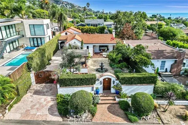 Welcome to this stunning Spanish Colonial home, captivating you from the moment you walk into the front garden. Located in the heart of the Laguna Beach Village, this gorgeous property is close to the beach, Heisler Park, shops, and restaurants. The large private courtyard showcases a beautiful landscaping area with mature fruit and olive trees, an outdoor kitchen with a fireplace, a two-tier fountain, a wood-burning pizza oven, and a tranquil pond with a waterfall. The courtyard is fully equipped with custom FX Luxor brass and copper LED lighting, presenting a spectacular nighttime display, making the courtyard the perfect area for entertaining family and friends. The interior of this home is equally as impressive. It offers two bedrooms, two full baths, and an extra den, which can be converted into a third bedroom. The kitchen has a separate dining area which opens to the main living room with a fireplace. There is also a roomy loft perched above the master walk-in closet. The home's interior possesses beautiful hardwood floors, custom hand-painted Spanish tiles, arched doorways, ornate solid wood doors, and much more. The back and side yard are private, with an outdoor shower, a sitting area, and a stunning entrance to the driveway equipped with an automatic opener for the stylish entry wood gate. Parking for four cars, garage storage, and street parking are available. Beautiful ocean and mountain views are visible from the courtyard.