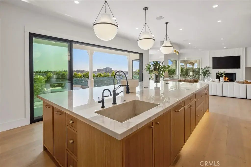 Welcome to a Newport Beach estate like no other, where Santa Barbara-inspired timelessness meets the height of contemporary luxury. Completely rebuilt, redesigned, and ready to take your breath away. From the moment you step through the striking iron entry door, an impressive foyer greets you with checkered marble flooring, and grand living spaces unfold, adorned with herringbone white-oak floors and a sleek wood-slat accent wall that whispers sophistication. The heart of this home is an exquisite chef's kitchen, where a 14-foot quartzite island commands attention, flanked by custom wood cabinetry and state-of-the-art appliances. Bonelli sliding doors dissolve into a resort-like backyard oasis. Breathtaking harbor and ocean views paint the horizon, while a pool, spa, fire pit, and built-in BBQ beckon for seamless indoor-outdoor entertaining. A sunken bar with a pass-through awning window elevates the experience to new heights. Ascend the winding staircase, where custom iron railings add a touch of artistry. Upstairs, the primary suite awaits, boasting panoramic views and a luxurious plaster bath with a steam shower. An expanded custom closet indulges your every whim. Each of the four bedrooms is a sanctuary, en-suite and complemented by custom-built closets. A separate office and bonus room strike the perfect balance of work and leisure. With six fireplaces, elegant finishes, a Control 4 home automation system, and a three-car garage and expansive driveway, this residence delivers on every detail. Ideally located near top schools, parks, and the best of Newport Beach's dini