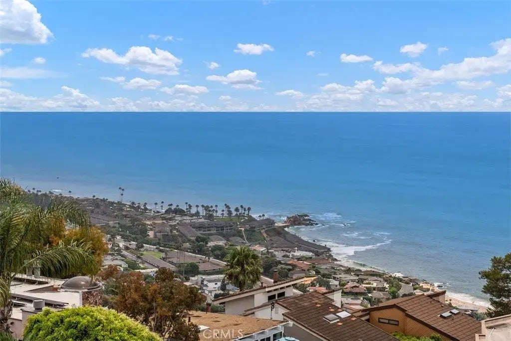 Experience awe-inspiring, panoramic views of the ocean and sunset from nearly every room in this sophisticated coastal home, which is located on a quiet dead-end street overlooking the Montage Resort just to the south. Taking full advantage of its commanding hilltop location, the residence features a dramatic ocean view living room with sit down views, presented through a wall of large windows and dual sets of sliding glass doors. A whitewashed, coastal-themed interior ensures that nothing distracts from the alluring, dynamic hues of the sea and sky; a spacious covered terrace makes it possible to relax outside and enjoy the ocean breezes, even when rain is in the forecast. Entering from the terrace, the dining room allows for ocean view entertaining. Rough-hewn vaulted ceilings and new wood floors balance the deep blues of the ocean and sky; a bespoke gourmet kitchen, a primary suite with a seamless corner window and a unique, well-conceived floor plan are further examples of the attention to detail that went into the renovation of this inviting home. Multiple skylights create a cheerful atmosphere in the open concept family room/kitchen. Separated by a large center island, the kitchen offers granite counters, custom cabinets with glass insets, a stylish tile backsplash and new high-end SS appliances, including dual ovens and a gas range. Along with endless ocean views, the primary suite has a large closet with built-in dressers and a soaking tub. Generous secondary bedrooms, an updated secondary bathroom with stone counters and a spacious walk-in shower, an expansive lowe